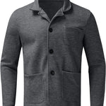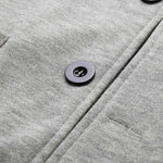 Denne jakke har et afslappet snit med krave, knaplukning foran og to påsyede lommer. Materialet fremstår blødt og struktureret, hvilket giver et tekstileret udtryk. Designet kombinerer elementer fra skjorte og blazer og vises i flere varianter med samme form og detaljer.