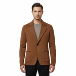 Denne jakke har et klassisk blazersnit med reverskrave, enkel knaplukning og to åbne forlommer. Materialet fremstår struktureret og blødt, hvilket giver et afslappet men velklædt udtryk. Designet vises i flere varianter med samme form og detaljer.