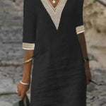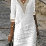 Den ubesværet elegante og behagelige fritidskjole til kvinder - hørblanding - V-hals med blondekant - afslappet pasform med 3/4-ærmer er perfekt til udflugter i det varme vejr. Kjolen er fremstillet af en åndbar hørblanding og har en flatterende V-hals med delikat blondekant og trekvartlange ærmer. Den løse pasform sikrer komfort hele dagen og gør den ideel til afslappet brug.