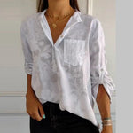 Denne bluse har en løs pasform med krave og en kort knapstolpe foran. Ærmerne er trekvartlange og kan bæres opfoldede. Overfladen har et diskret mønster, der fremstår tonet og giver blusen et struktureret udseende. Designet vises i flere varianter med samme snit.
