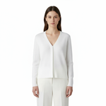 Denne cardigan har en V-udskæring og en gennemgående lynlås foran. Designet er enkelt med lange ærmer og en let figursyet pasform. Stoffet fremstår glat og strækbart, hvilket giver en fleksibel fornemmelse. Modellen vises i flere varianter med samme udformning.