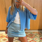 Denne kortærmede cardigan har en rund halsudskæring og en lige knaplukning foran. Designet er enkelt med en løs pasform, som giver et afslappet udtryk. Materialet fremstår blødt og jævnt, og modellen vises i flere visuelle varianter. Ærmelængden går til over albuen, og længden dækker hofterne.