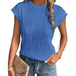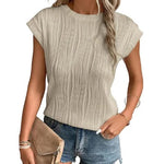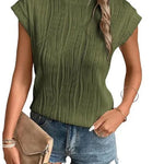 Denne strikkede top har en rund hals og korte ærmer med let udvidet skulder. Designet har en tydelig struktur med lodrette mønstre, der giver et markant visuelt udtryk. Pasformen er let løstsiddende, og længden går til hoften. Modellen vises i flere varianter med samme udformning.