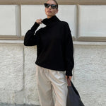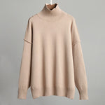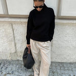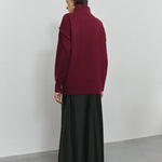 Denne striktrøje har en løs pasform med høj hals og lange ærmer. Designet er enkelt med ribkanter ved hals, håndled og søm, hvilket skaber en afbalanceret struktur. Trøjen er fremstillet i et jævntstrikket materiale og vises i flere varianter med samme udformning.