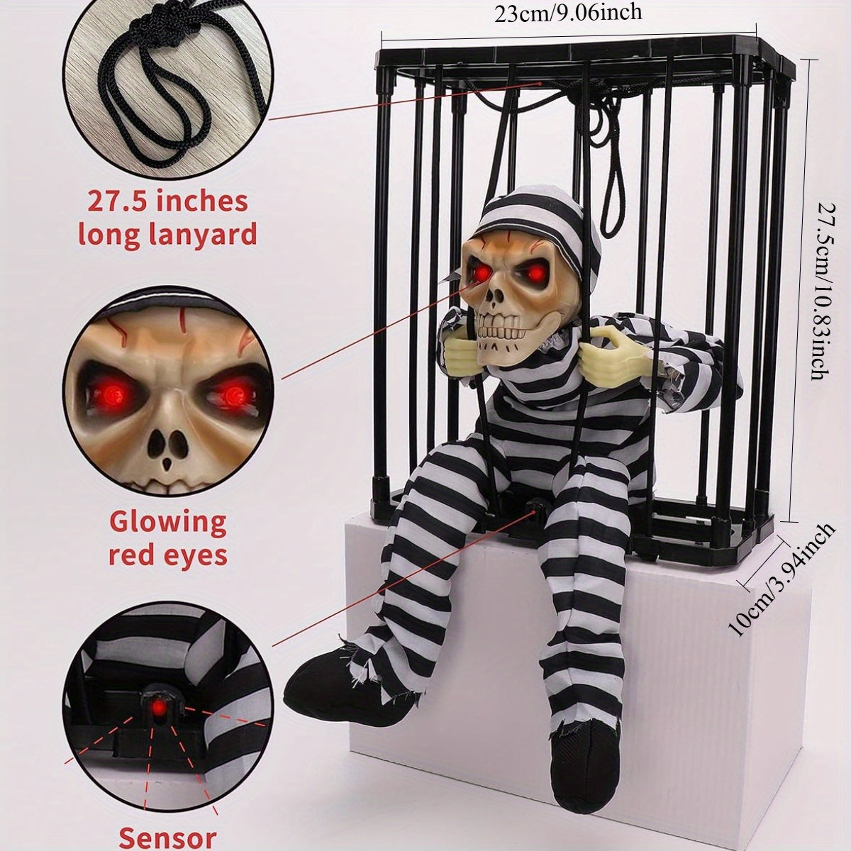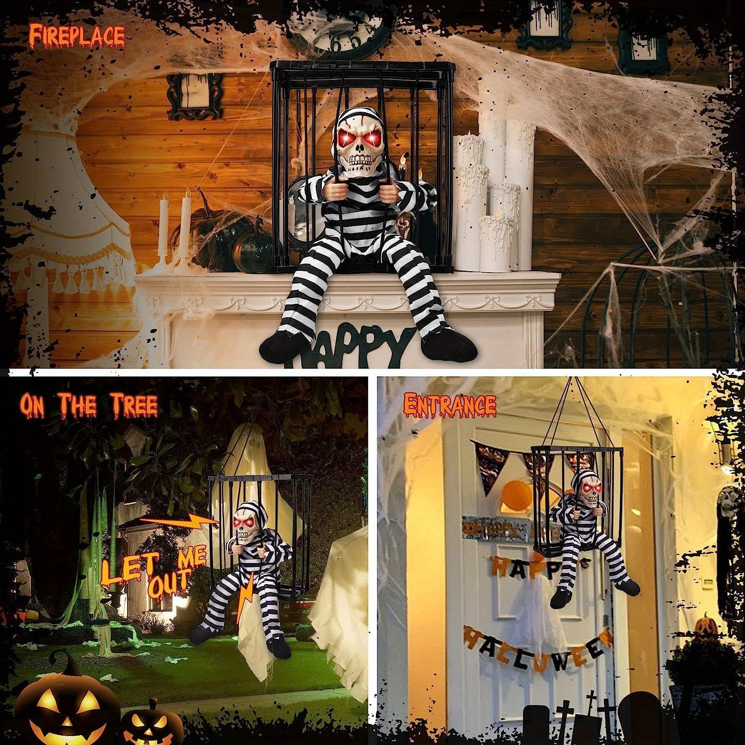 Když někdo projde kolem, vestavěný pohybový senzor spustí děsivé výkřiky a strašidelné pohyby. Ať už ji zavěsíte na verandu, do obývacího pokoje nebo jako součást strašidelného domu, tato strašidelná halloweenská dekorace okamžitě navodí atmosféru večírků, koledování a rodinných oslav.