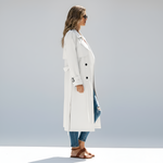 Esta gabardina larga para mujer está confeccionada en un tejido ligero y suave, típicamente una mezcla de algodón, que proporciona un ajuste cómodo y flexible. La gabardina tiene un cuello clásico con solapa, doble botonadura y cinturón para atar en la cintura, que realza la silueta sin apretar. Su corte recto y desenfadado hace que este trenchcoat sea ideal como abrigo de entretiempo para primavera y otoño, así como para el uso diario y ocasiones más elegantes. El tejido es ligero y cómodo de llevar durante todo el día y fácil de combinar tanto con vaqueros como con vestidos.