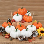 - Mængde: 12 stykker (farverig blanding af kunstige græskar, blade og detaljer)