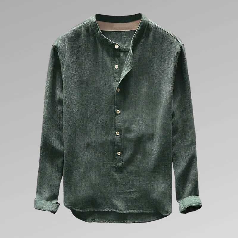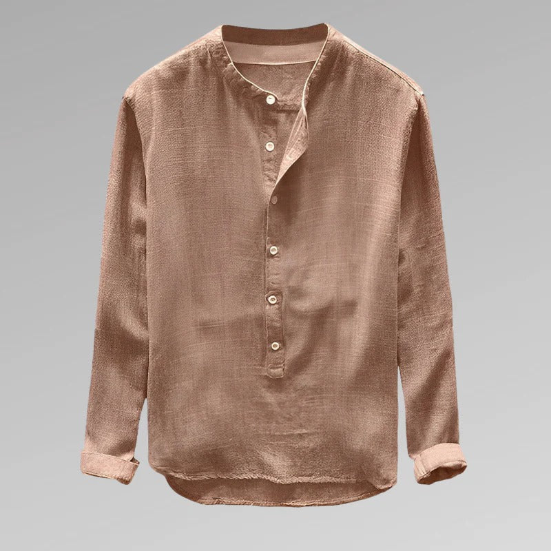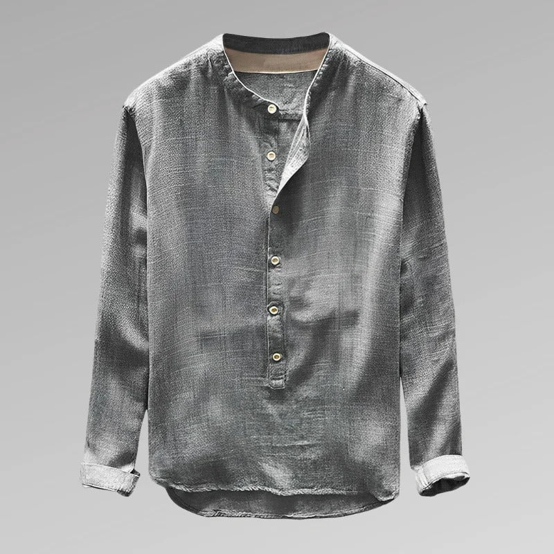 Denne skjorte har et afslappet snit med lange ærmer og en rund hals uden krave. Foran findes en kort knaplukning, som giver skjorten et enkelt udtryk. Stoffet har en let struktureret overflade, og designet vises i flere varianter med samme pasform og detaljer.