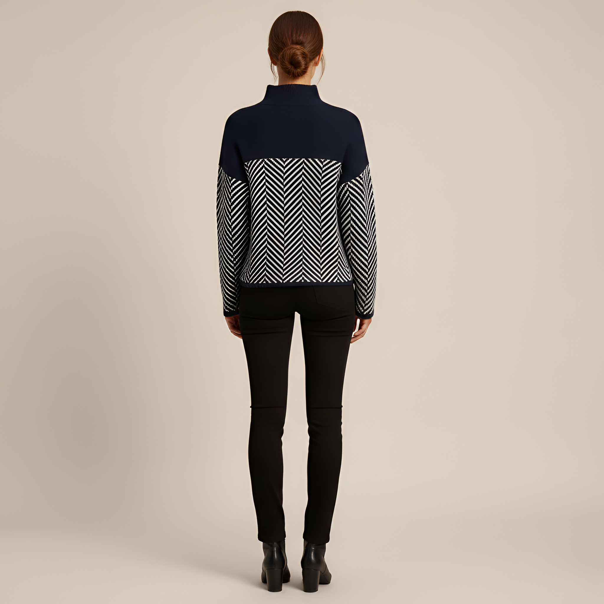 Acest pulover tricotat pentru femei este confecționat dintr-un amestec moale de lână, care oferă un echilibru plăcut între căldură și confort. Designul are guler înalt și un model tricotat grafic, care creează un aspect curat și modern. Croiala este lejeră și oferă libertate bună de mișcare, ceea ce face puloverul plăcut de purtat pe tot parcursul zilei. Un pulover tricotat din amestec de lână versatil, potrivit pentru muncă, uz cotidian și zile răcoroase.